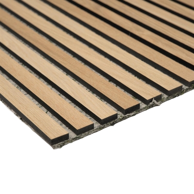 Tammiviilulla päällystetty akustiikkapaneeli harmaanvihreällä huopapohjalla ja mustin MDF-rimoin