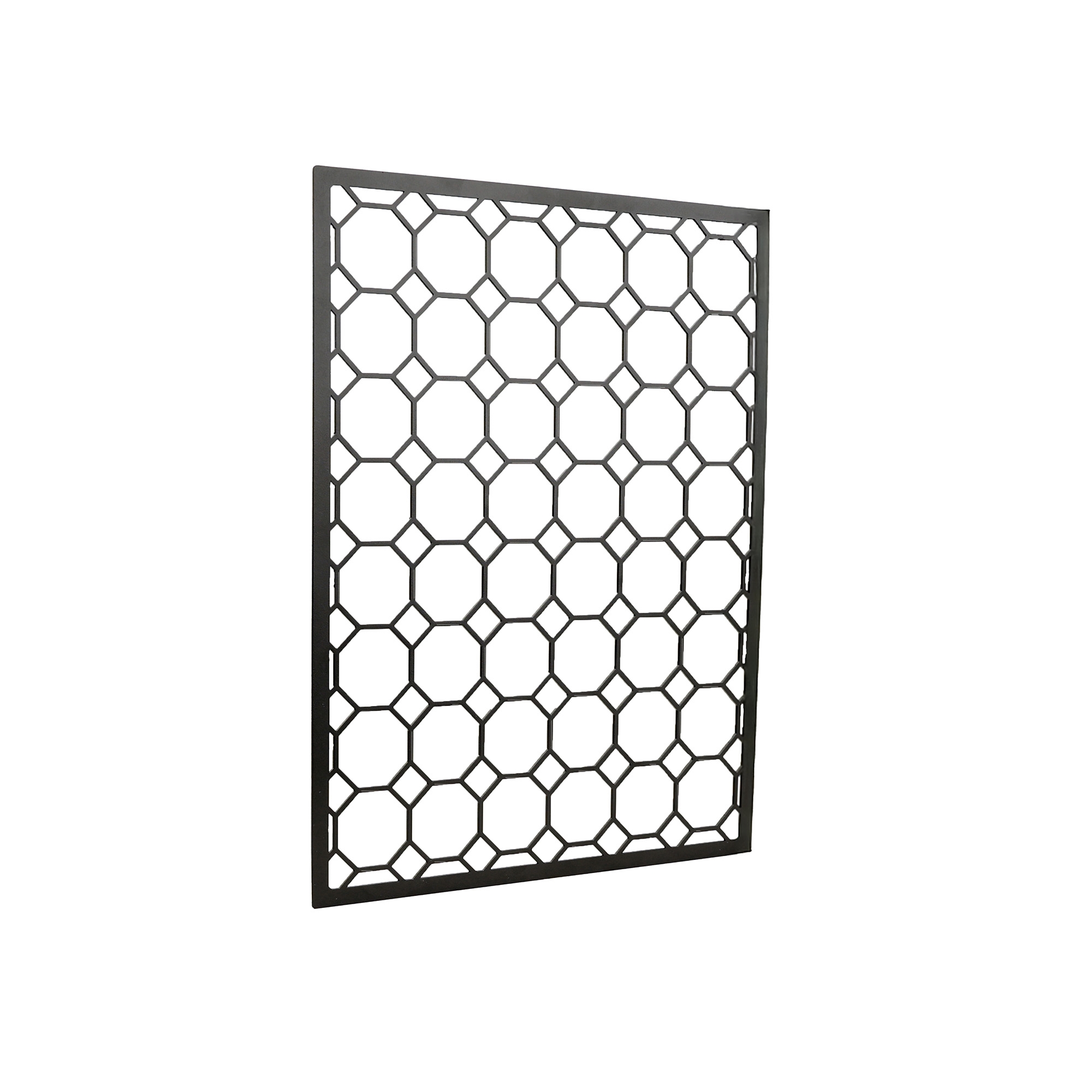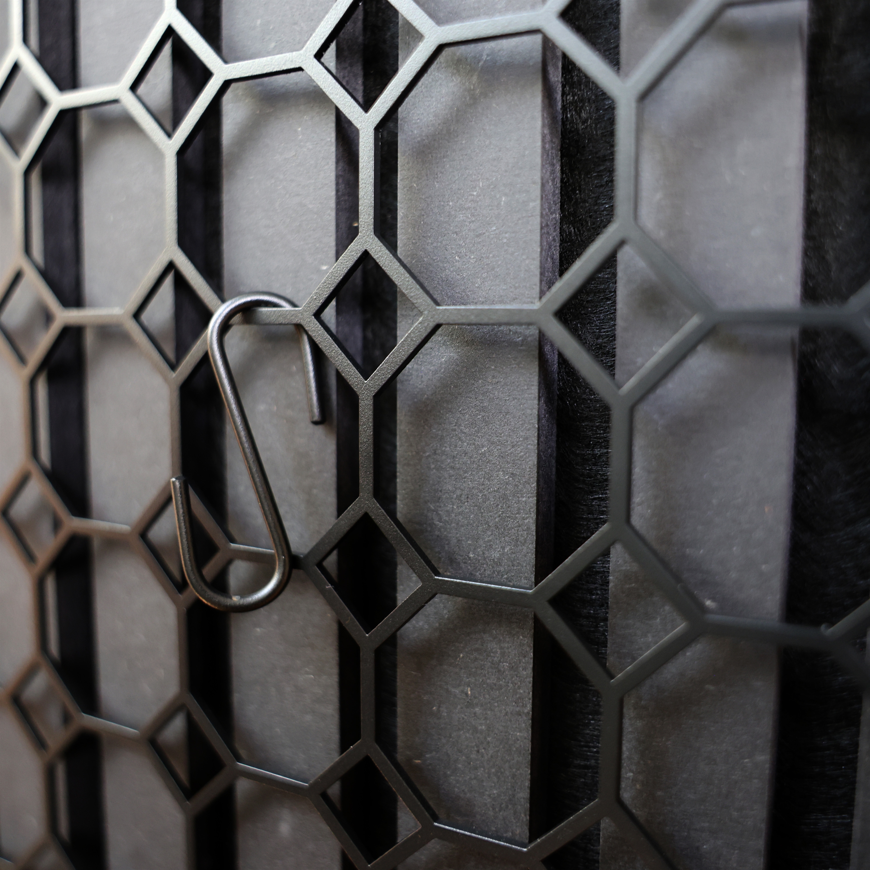 Musta metallinen ristikkolevy, jossa 4 S-koukkua